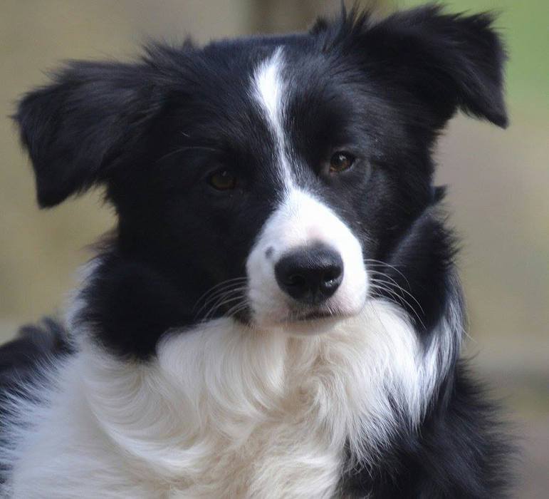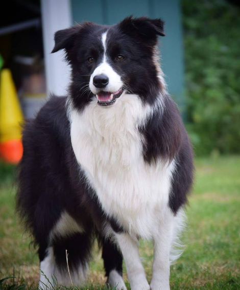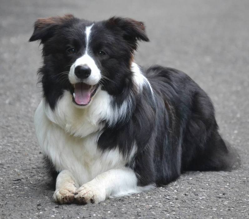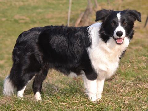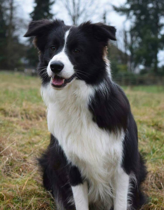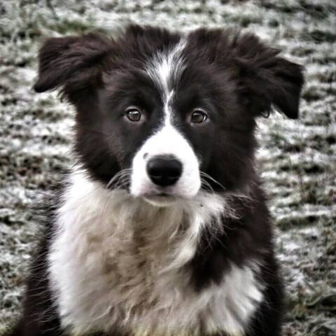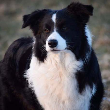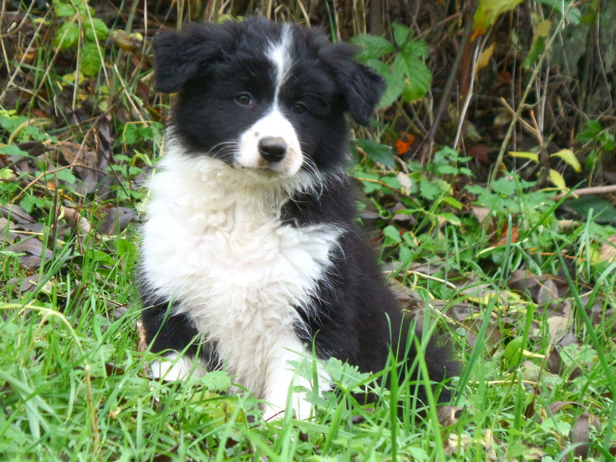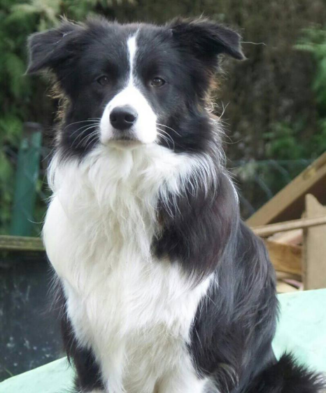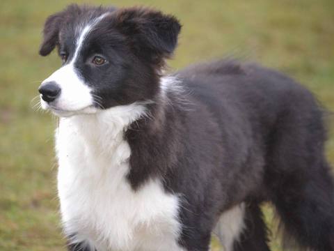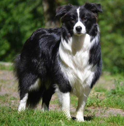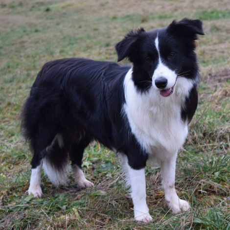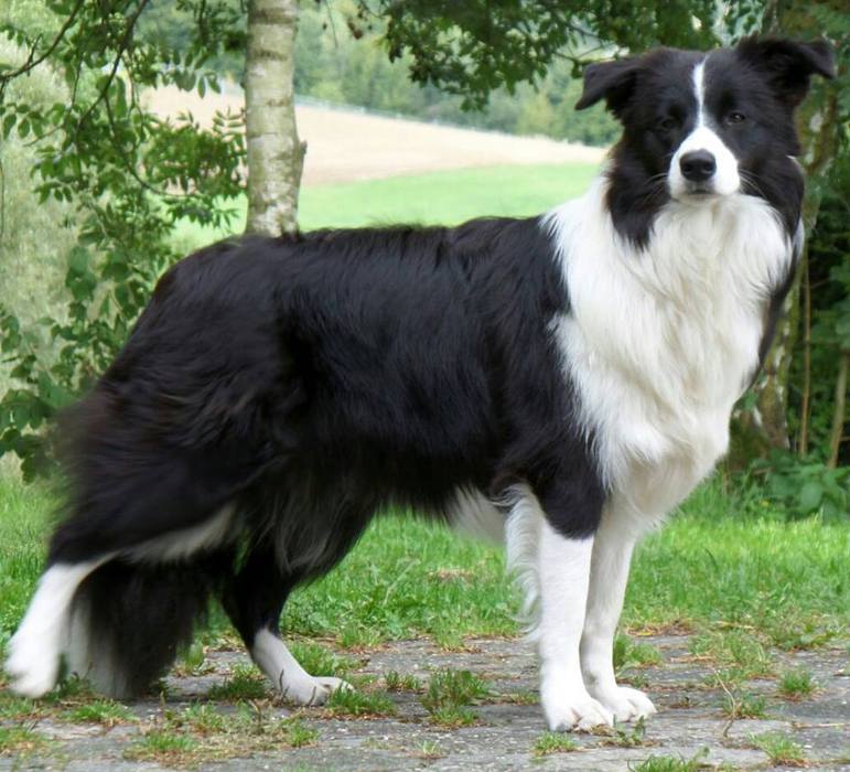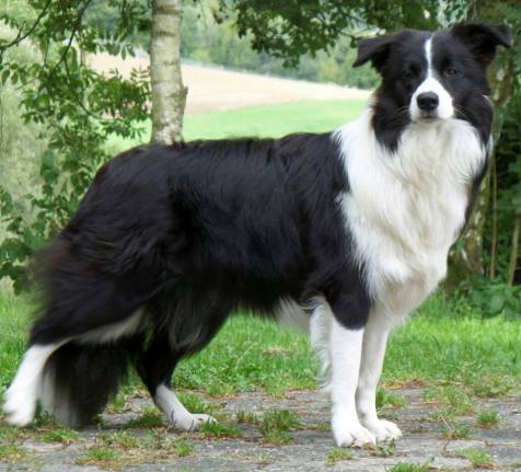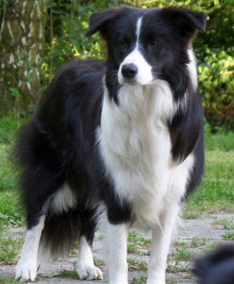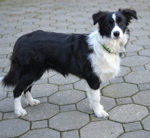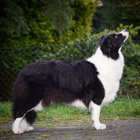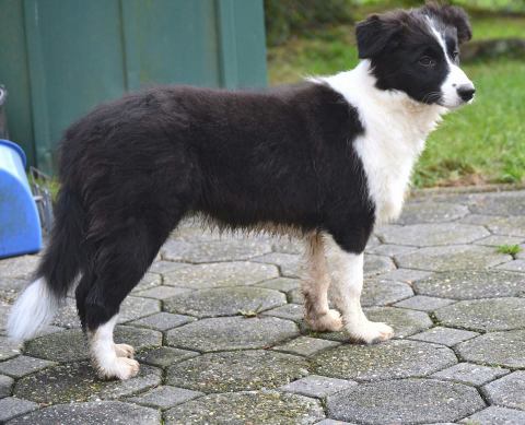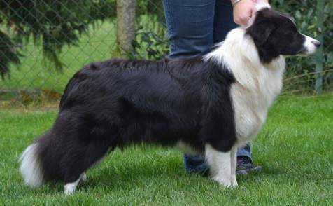 Harmonische, schwarz-weiße Hündin, schöner typischer Kopf mit gutem Stop, korrekte dunkle Augen, Ohren etwas seitlich getragen, gutes Pigment, schöne Halslänge, gut entwickelter Brustkorb, ausreichende Hinterhandwinkelungen, korrekte Rückenlinie, Haarkleid von korrekter Textur und schöner Farbe, aufmerksames und ausgeglichenes Verhalten.