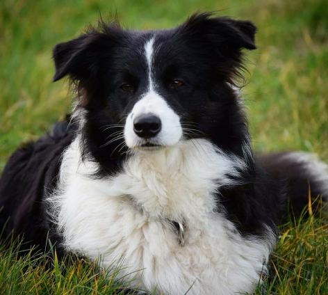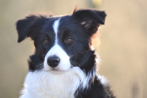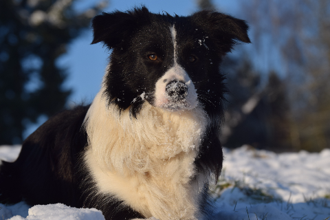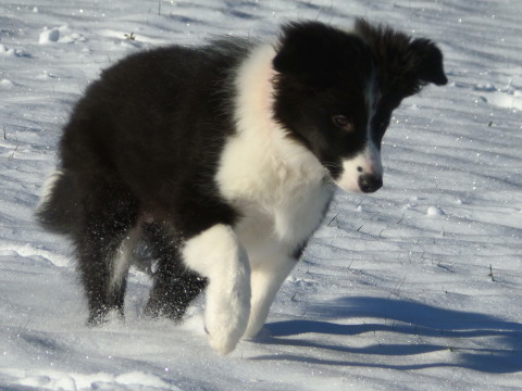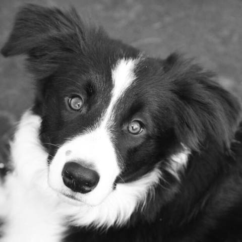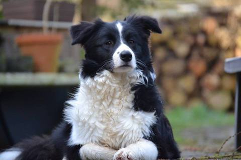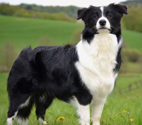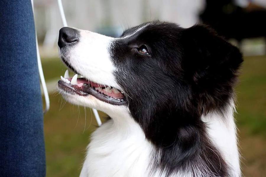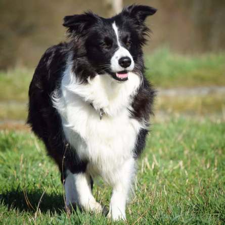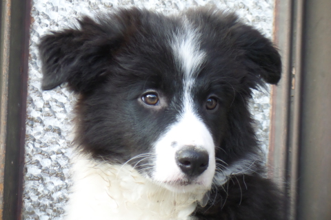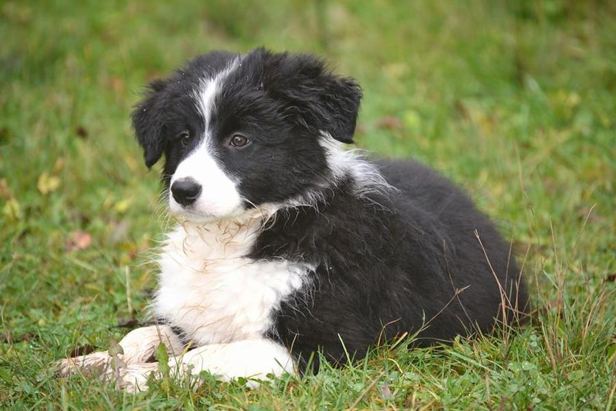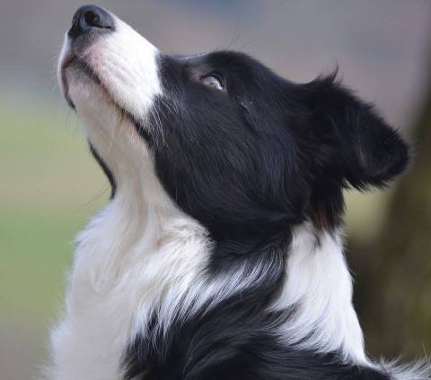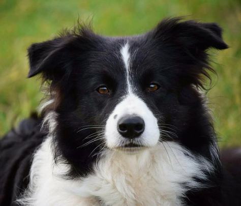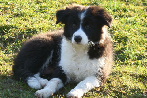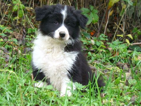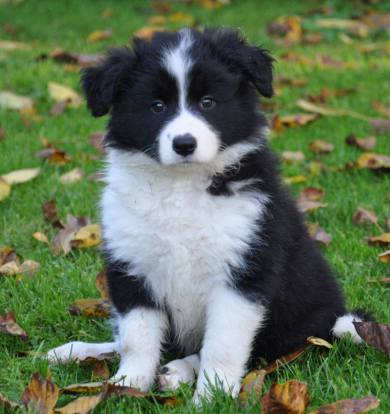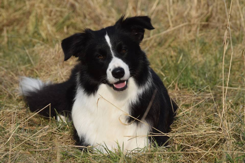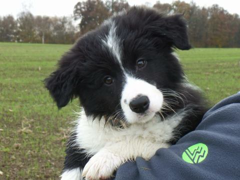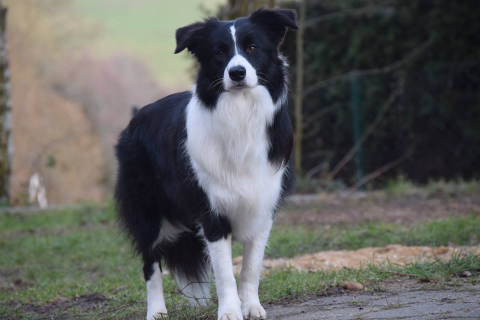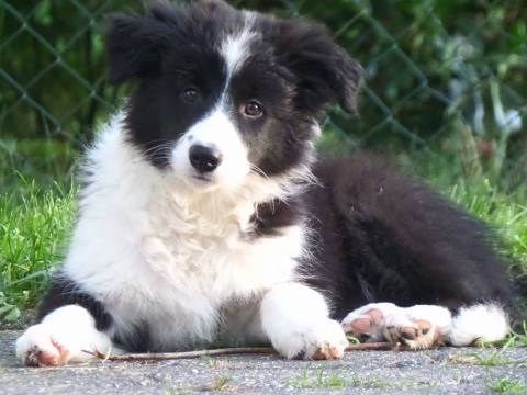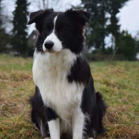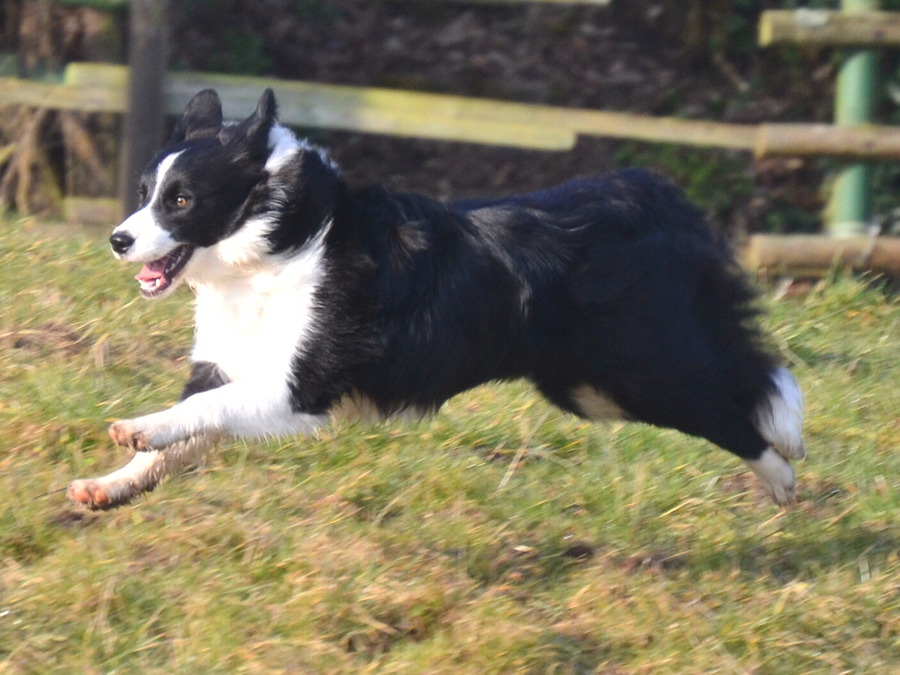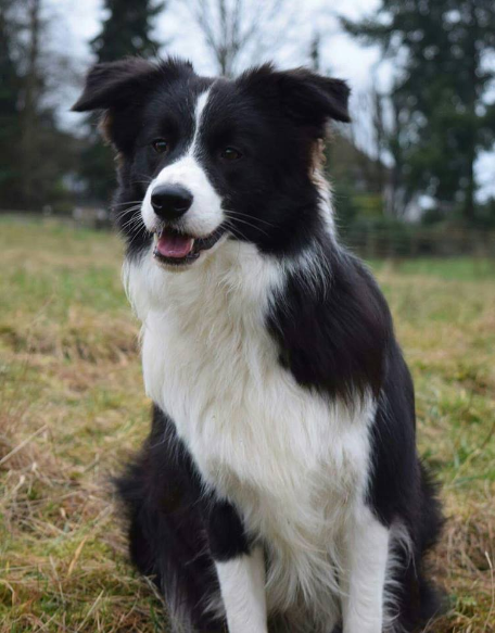 Harmonische, schwarz-weiße Hündin, schöner typischer Kopf mit gutem Stop, korrekte dunkle Augen, Ohren etwas seitlich getragen, gutes Pigment, schöne Halslänge, gut entwickelter Brustkorb, ausreichende Hinterhandwinkelungen, korrekte Rückenlinie, Haarkleid von korrekter Textur und schöner Farbe, aufmerksames und ausgeglichenes Verhalten.